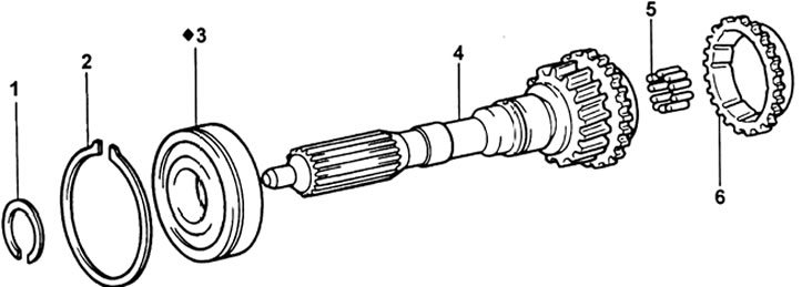 Первичный вал КПП G52. 1,2- стопорное кольцо, 3 - подшипник, 4 - первичный вал, 5 - игольчатый подшипник, 6 - кольцо синхронизатора.