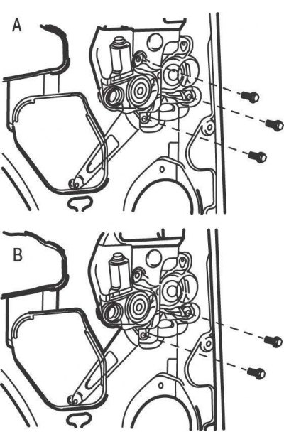 Рис. 14.39. Расположение болтов крепления стеклоподъемника задней двери: А — стеклоподъемник с ручным приводом; В — стеклоподъемник с электрическим приводом