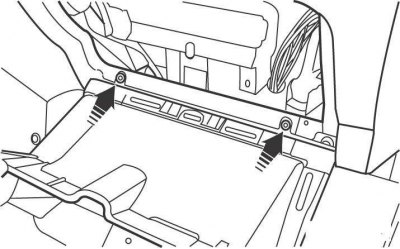 Сожмите ее с боков для освобождения из зацепления и опустите ее вниз, затем выверните винты крепления вещевого ящика (рис. 14.54).