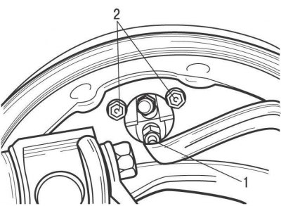 Выверните два болта 2 крепления рабочего тормозного цилиндра к защитному кожуху заднего тормоза. Соблюдая осторожность, снимите рабочий тормозной цилиндр.