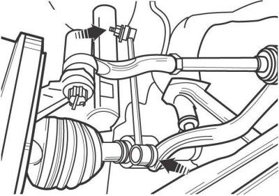 На моделях выпуска до 2001 года при снятии стабилизатора поперечной устойчивости отворачивайте верхнюю гайку крепления тяги стабилизатора, а при снятии нижнего рычага передней подвески — нижнюю гайку.