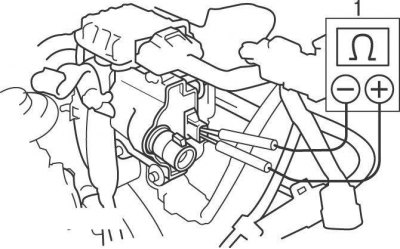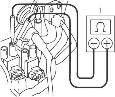 Рис. 6.1. Подсоединение омметра (1) к контактам электрического разъема для измерения сопротивления первичной обмотки катушки зажигания на моделях с 1996 по 1998 год