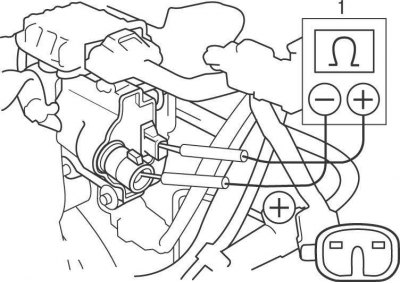 Рис. 6.3. Подсоединение омметра (1) для измерения сопротивления вторичной обмотки катушки зажигания на моделях с 1998 по 2001 год