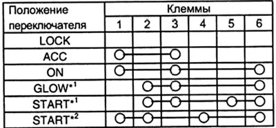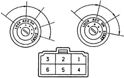 Проверете за непрекъснатост между клемите на конектора на ключа за запалване. Сменете ключалката, ако не работи, както е описано в таблицата.