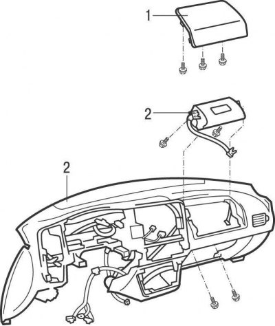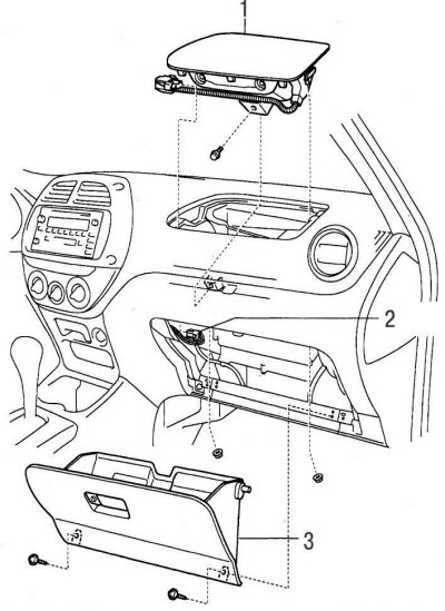 Фиг. 15,64. Въздушна възглавница за предния пътник на модели преди 2001 г.: 1 – декоративен капак; 2 – въздушна възглавница за предния пътник; 3 – арматурно табло