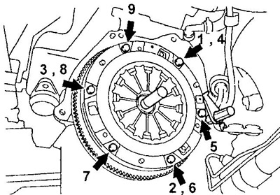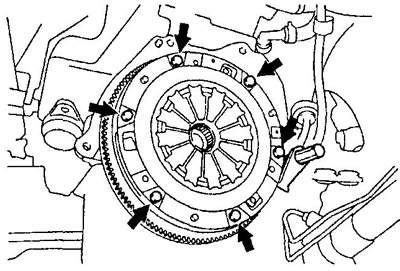 c) Отстранете всички монтажни болтове и отстранете корпуса на съединителя и диска на съединителя от маховика на двигателя.