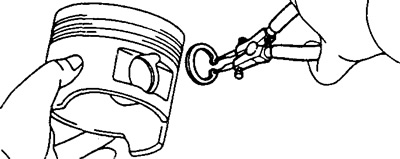 b) С помощта на разширител на бутални пръстени монтирайте двата компресионни пръстена с кодовата маркировка нагоре.