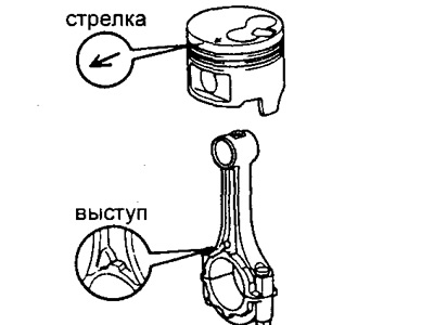 c) Подравнете предните странични маркировки, разположени на буталото и свързващия прът, след това монтирайте буталния болт и втория задържащ пръстен в буталото.