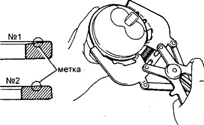 c) Монтирайте буталните пръстени, така че ставите на пръстените да са разположени, както е показано на фигурата.
