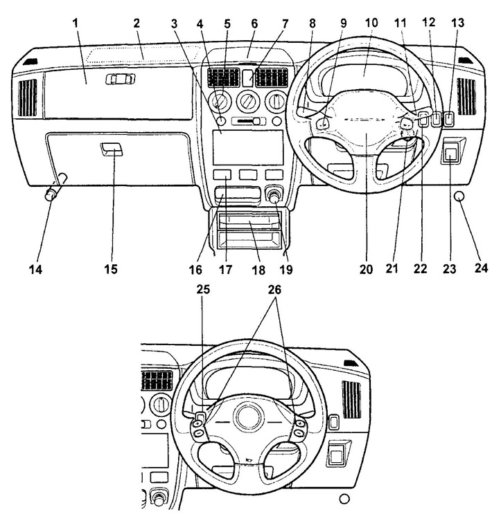 1 - дополнительный вещевой ящик в левой части панели приборов,