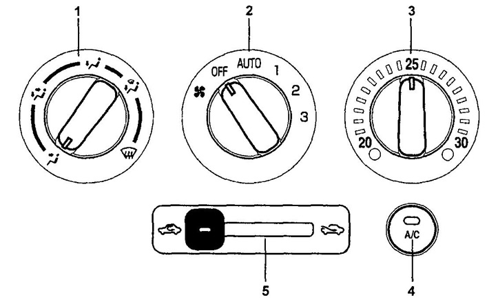 Если режим кондиционера был включен перед последним выключением, то при перемещении переключателя скорости вращения вентилятора отопителя (2) из положения "OFF" сразу начнет работать режим кондиционирования. При повторном нажатии на выключатель "А/С" (4) выключится режим кондиционирования и будет работать отопитель. Отопитель работает, если отключен режим кондиционера.