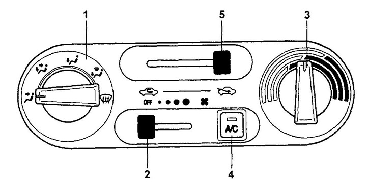 1. Для включения отопителя необходимо перевести переключатель скорости вращения вентилятора отопителя (2) из положения "OFF" в любое другое. Для включения кондиционера необходимо нажать на выключатель кондиционера "А/С" (4). При включении кондиционера на выключателе загорается индикатор.